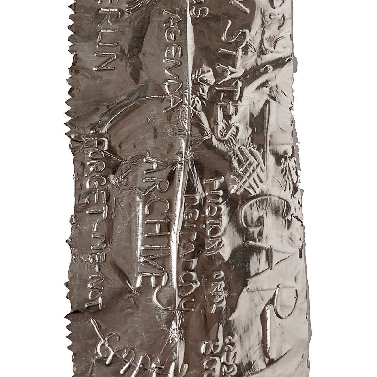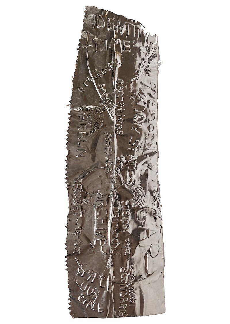This is an art of the gap relic. Created with reused aluminium foil which will take hundreds of years to decompose, it’s also a relic of the anthropocene. While the material will last, the marks can be smoothed and erased in moments. This possibility for transformation is deeply interesting to me.Alongside this digitally printed postcard and video projection, I’ve sent a series of postcard experiments that may or may not arrive. They feature other-than-human ecosystems or Maxie, my dog are made from different materials: foil, canvas and SCOBY = a Symbiotic Culture Of Bacteria and Yeast. This living system grows on the top of kombucha (from a brewer in the village next to me). It is a renewable organic material that I have dried into parchment but can be rehydrated. Unlike foil, it’s completely biodegradable and exists in a different space-time. If they don’t turn up they’ll be another gap, if they do they may have been transformed by their journey (one was coated with cyanotype so will respond to the light it encounters). These different materials allow for a different kind of understanding.