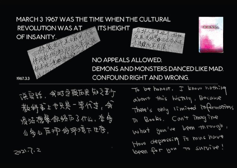 It all started when I discovered letters and files in my grandfather’s house after he passed away. I was able to witness the social shifts and political upheavals that the older generation in China lived through because of these materials. In that unfathomable social context, they repressed their sentiments and emotions. As a descendant of theirs, I gathered these historical letters, archived them on postcards, put my messages to them on the postcard, and returned it to them. It’s a postcard that will travel through time and space, and I’m hoping it will arrive where I want it to.