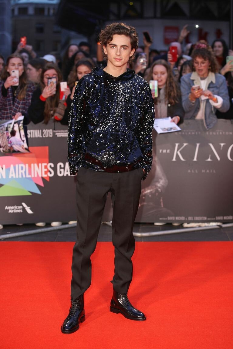 Timothee Chalamet wears a Louis Vuitton hoodie, embroidered with 3000 Swarovski crystals and 15.000 sequins on the Golden Globes red carpet.