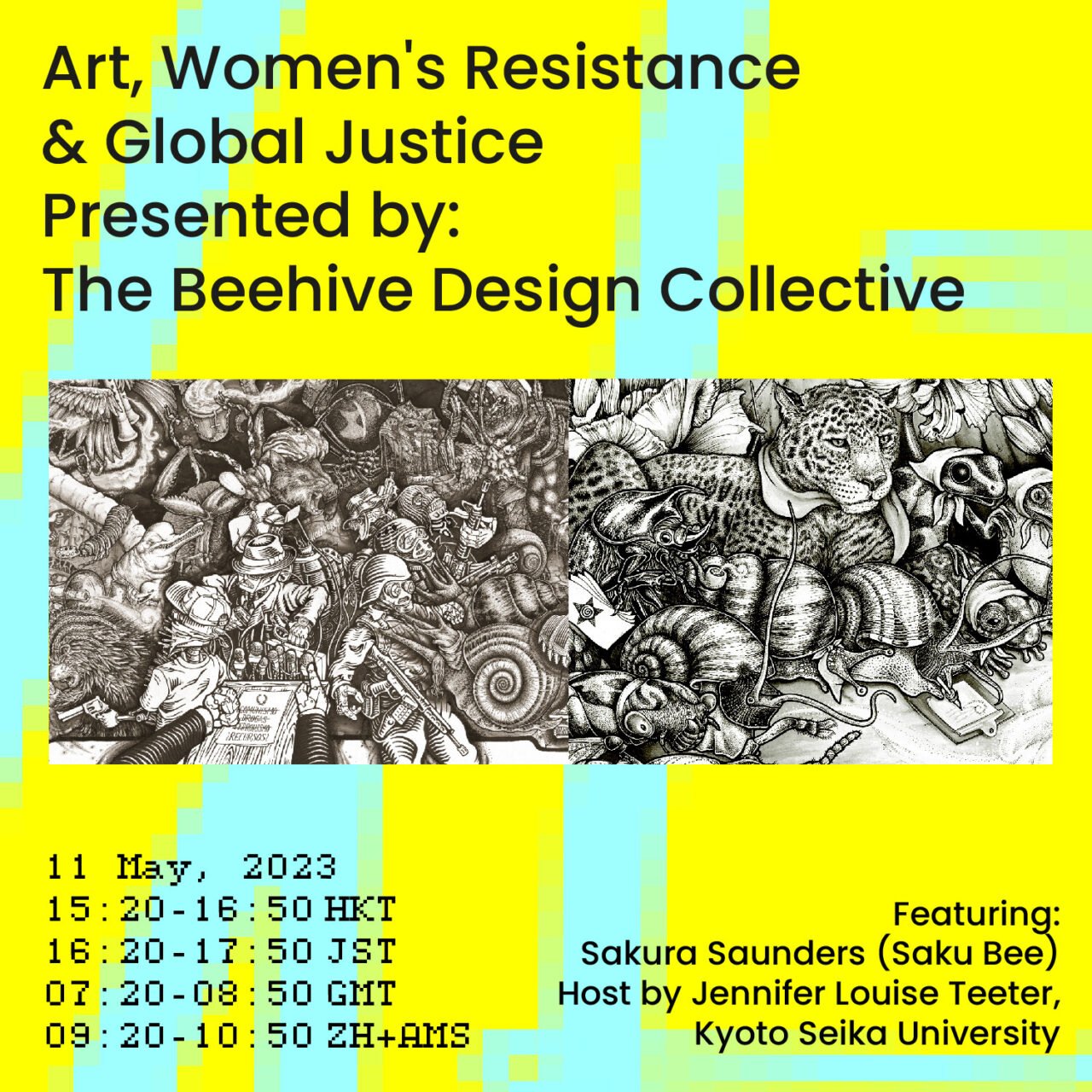 Saku Bee will be presenting Mesoamérica Resiste, the third and final instalment in the Beehive’s trilogy on globalization in the Americas. The intricate, double-sided image documents resistance to the top-down development plans and mega-infrastructure projects that literally pave the way for resource extraction and free trade. She will highlight stories of cross-border collective action, especially organizing led by women both within and at the forefront of social movements. While focusing on stories from Mexico and Central America, we will weave a much larger narrative about ways people are fighting back against a global economy based on colonialism, land grabs, and exploitation, and building alternative economies, all over the globe.