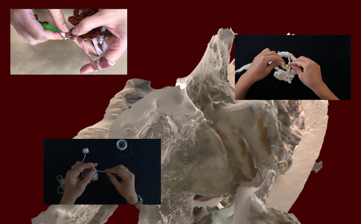 Next to the digitality of our meeting and crocheting sessions, which initiated our intermedial approach to the craft, we further explored the transfer of bodily gestures to the realm of the digital through 3D scanning applications. Each of us scanned their crocheted object, moving it from physical to digital space, where we intermeshed and wove them together; creating a unified digital meta-textile. The final outcome of our online collaboration manifested in a split screen video work, showing the act of parallel crocheting and the digital meshwork of our interwoven object in a looped rotation; highlighting the dialogue between the analog and the digital as well as the inter-relational aspect of creating in a community.