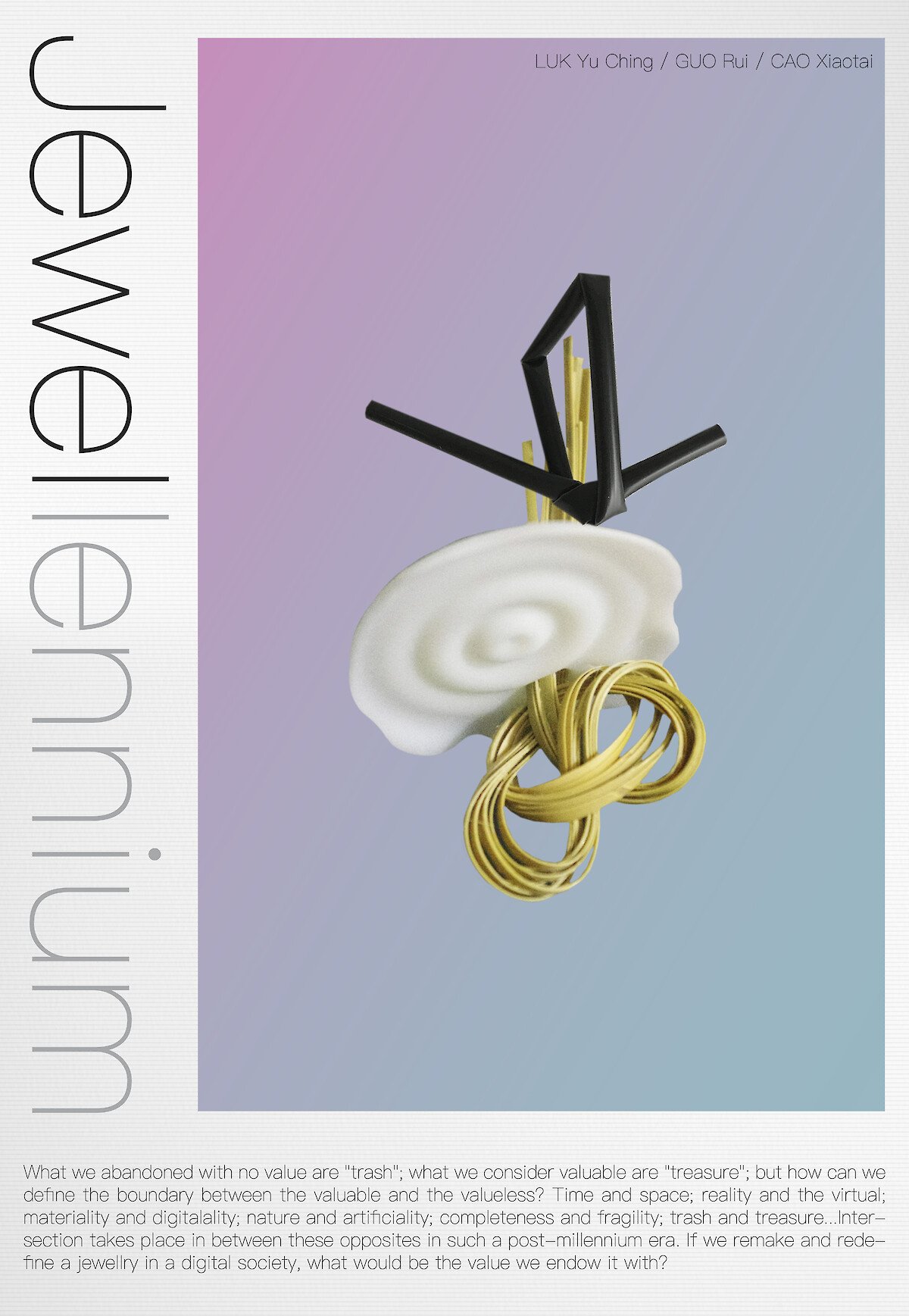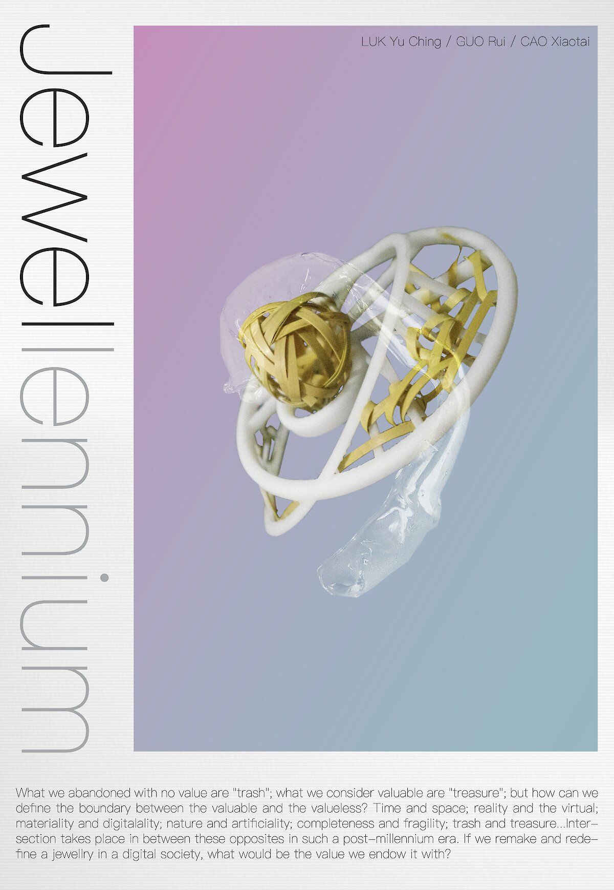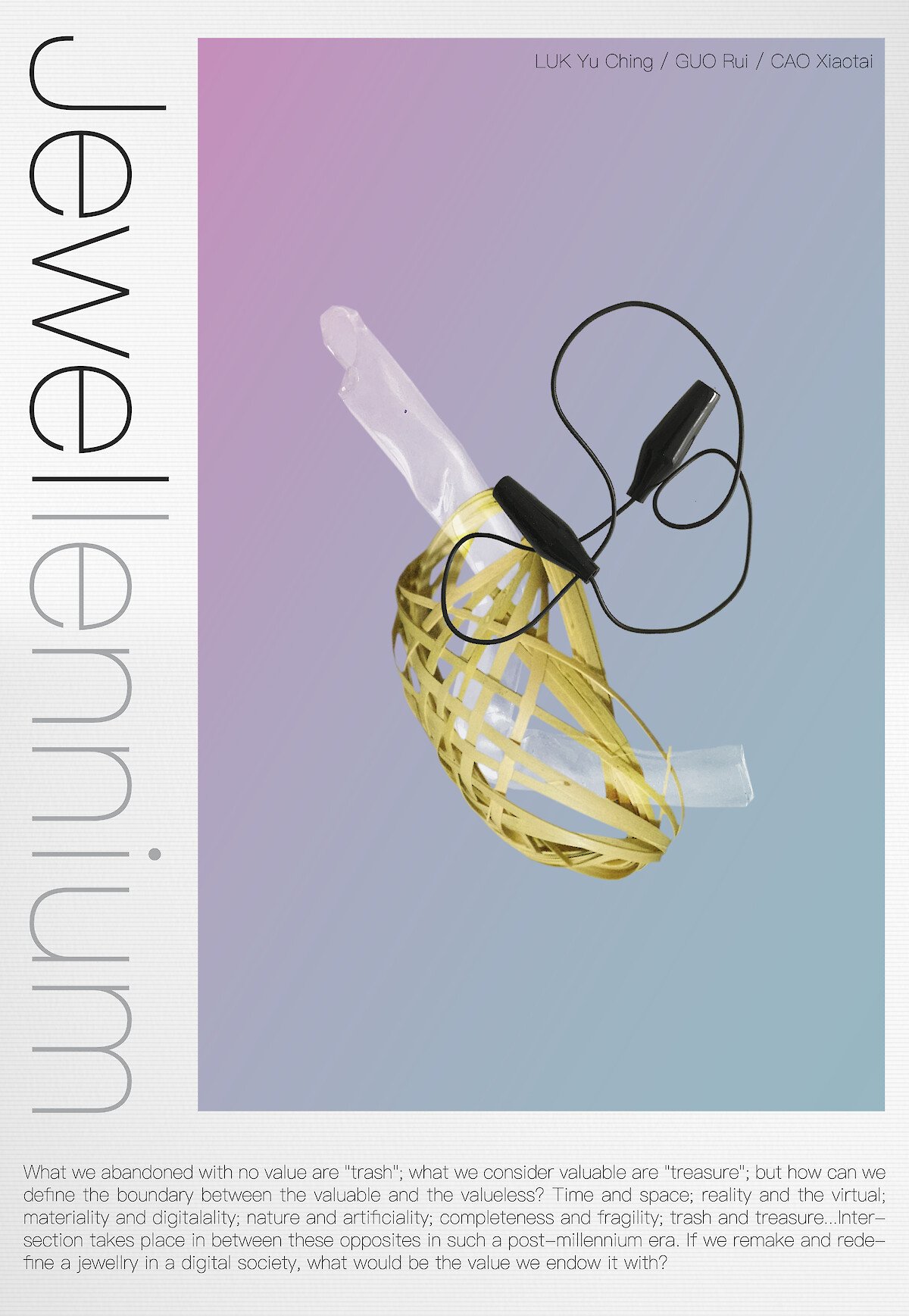 Our project name “Jewellennium” is combined from Jewellery and Millennium, simply implying that we are to discuss the valuable things in craft in our digital, post-millennium society relating to the jewellery culture.