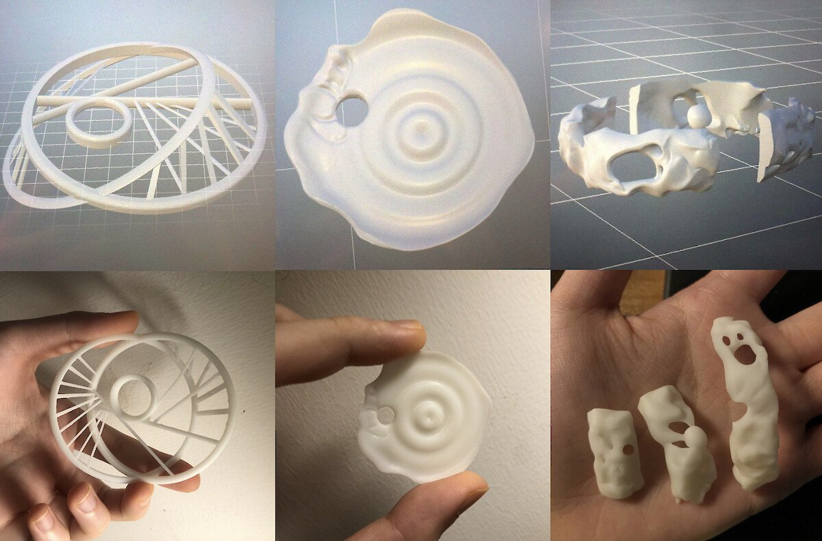 Then there are our prototypes from Tokyo. It’s super exciting that Terence had collected so many plastic recyclables, because of Japan’s policy on recycling that is fine enough to make these structures as prototypes for his glass-blowing items. He also provided 3D data, and we chose two different resin materials to print these digital imitations.