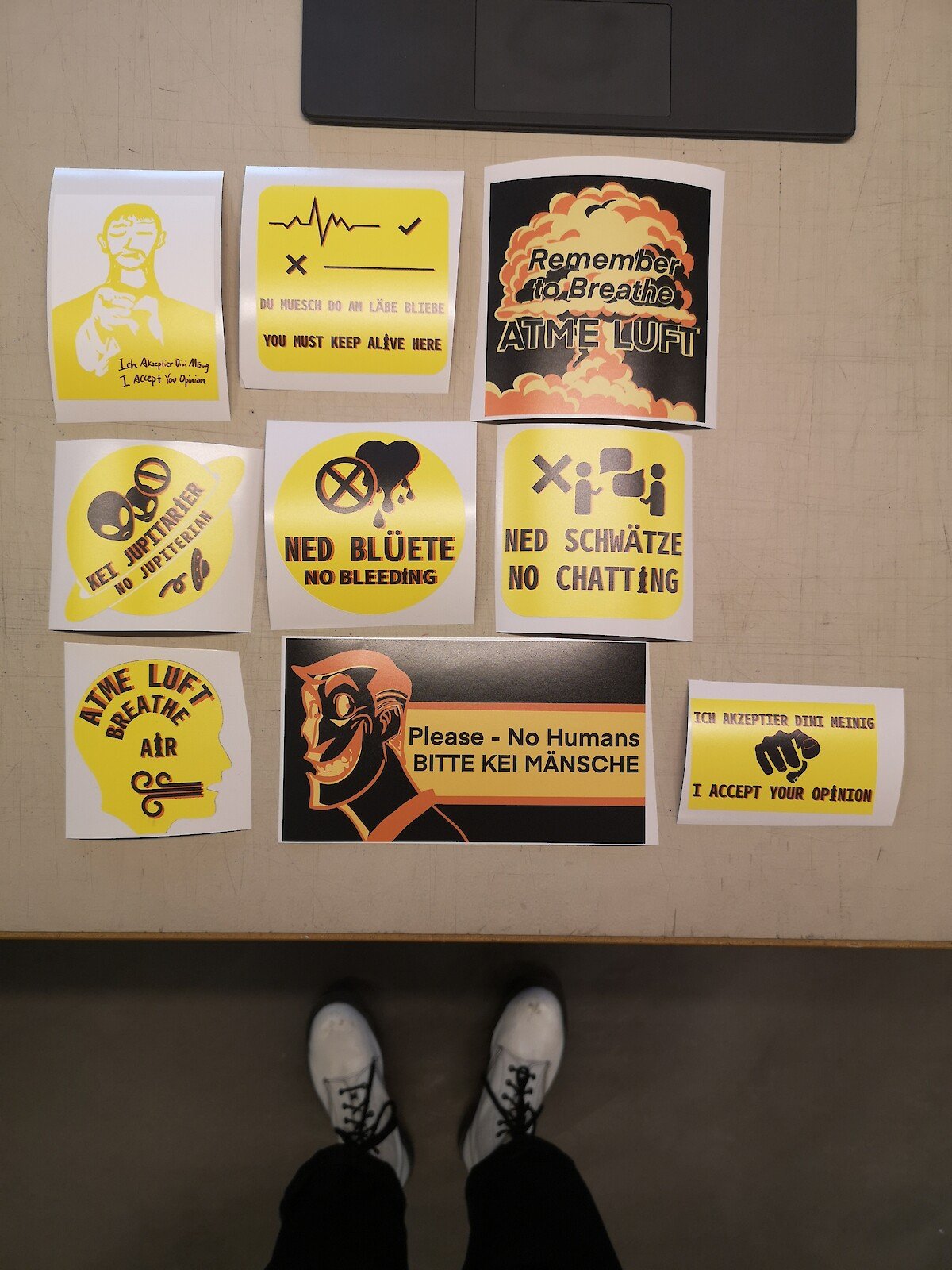 The limitation of behaviours in public spaces from the government seems to be a common and normal component in modern communities. However, if we observe at different cities with the focus of signs in public areas, we may find that their content is highly sensitive to the urban context, leading us to reflect on the definition of “public space”, and to question the normality of these oppressive public signs. After collecting rich language materials from the streets in field trips and research, we designed a series of posters and stickers, trying to mock the nonsensical governmental road signs/banners in public spaces. We hope that the posters and stickers will serve as a voice from the public that indirectly responds to the authoritative, centralised power from the government.