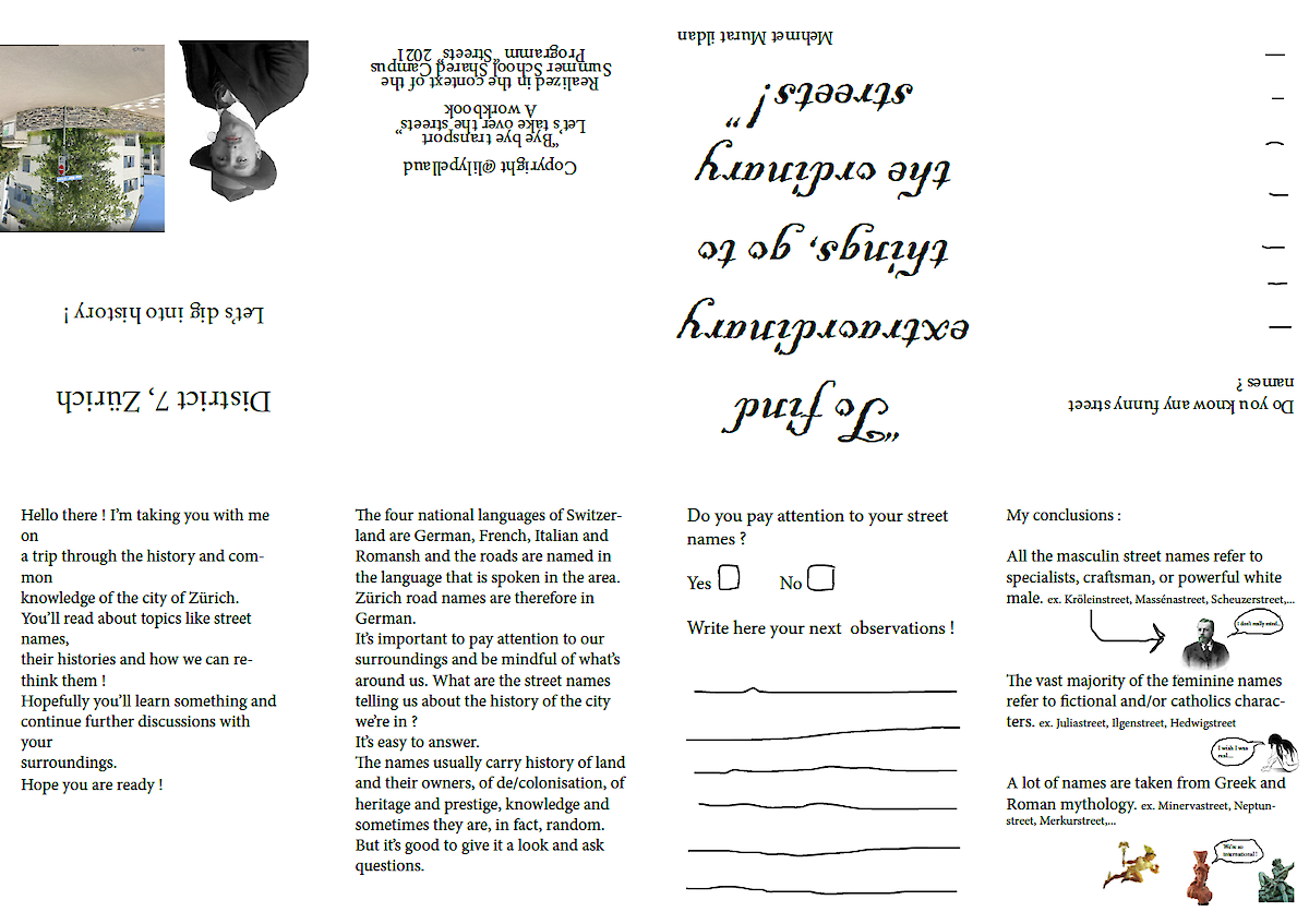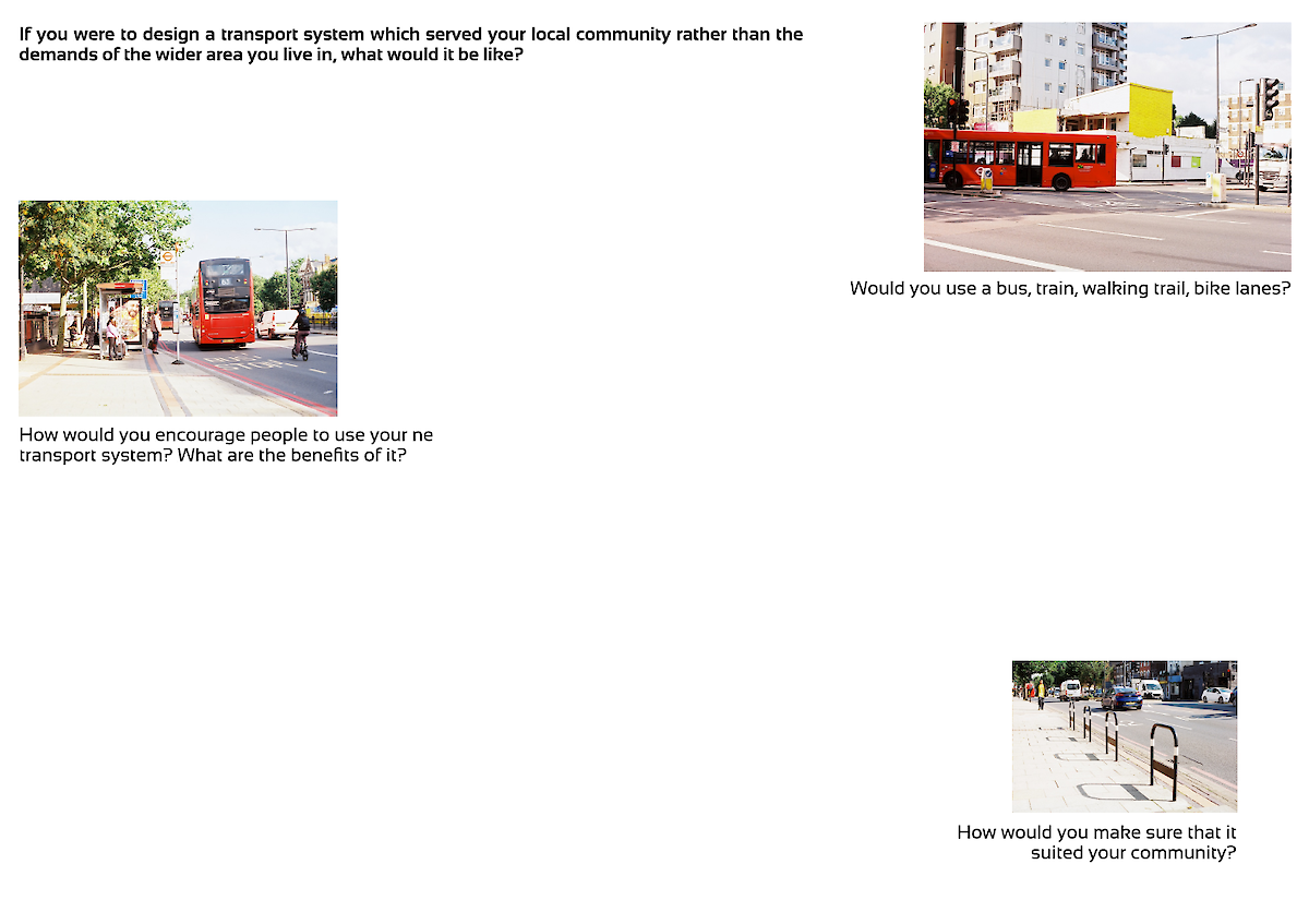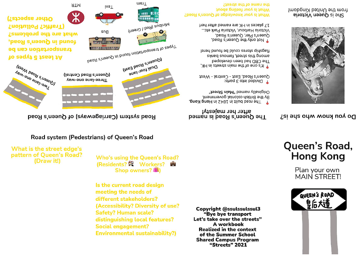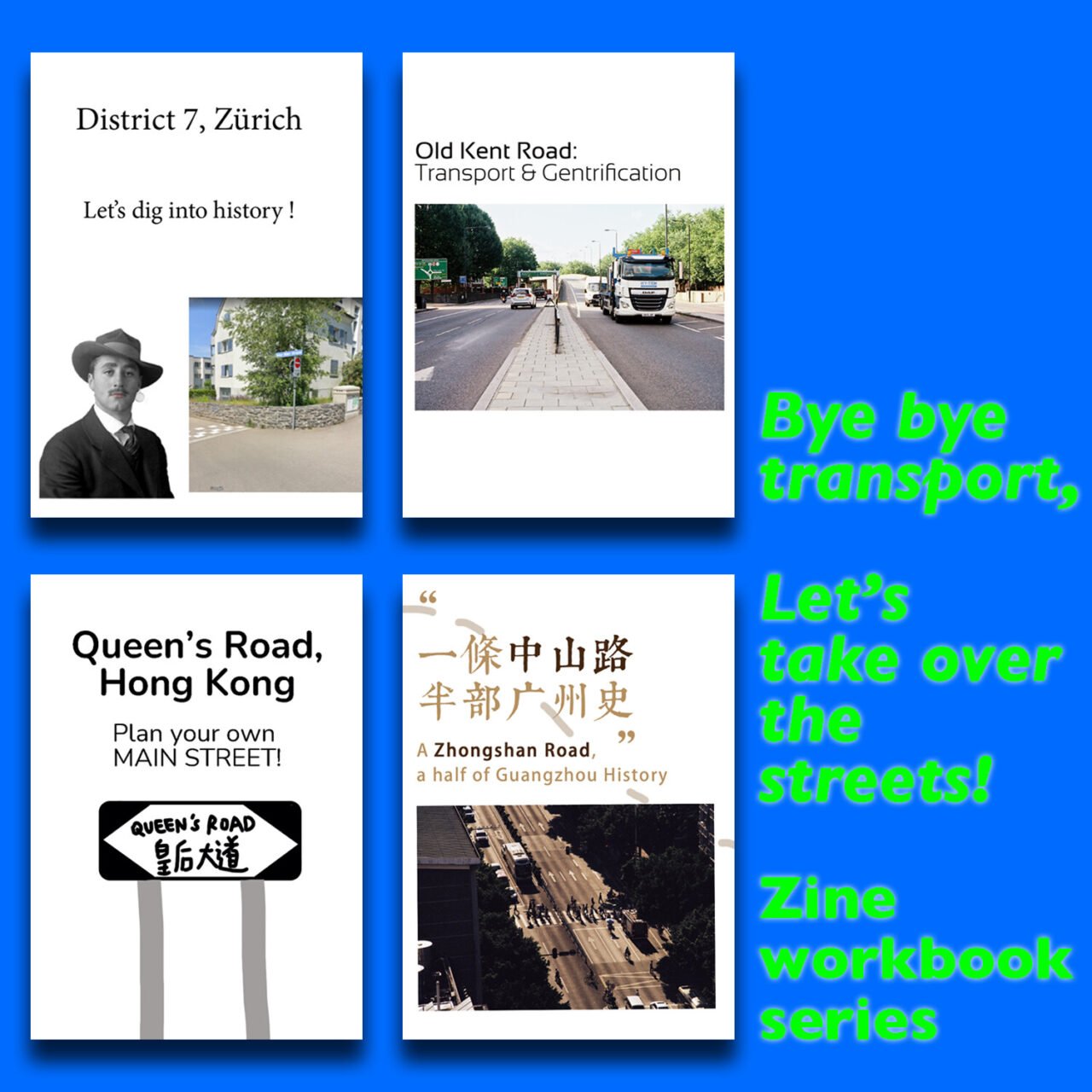 “Bye Bye Transport, Let’s Take Over the Streets!” is a series of workbooks created to encourage reimaginations of the societal effects of transport links. This project looks at streets in four countries around the world, analysing their histories and engaging the reader in an interactive, self-reflective experience. Our workbooks tackle subjects such as who has ownership over public spaces, the neocolonial power of street naming, and the gentrifying effect of increased transport links. We encourage our readers to sit with the workbooks and observe their own cities.