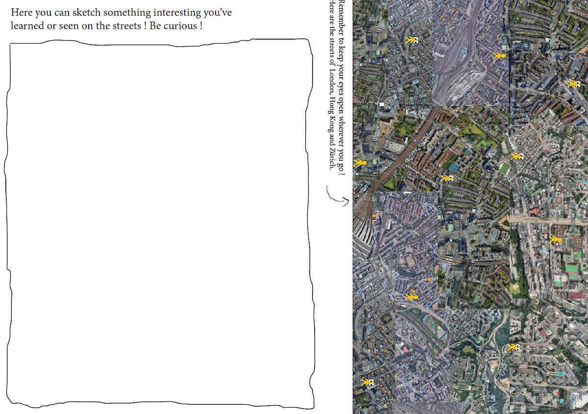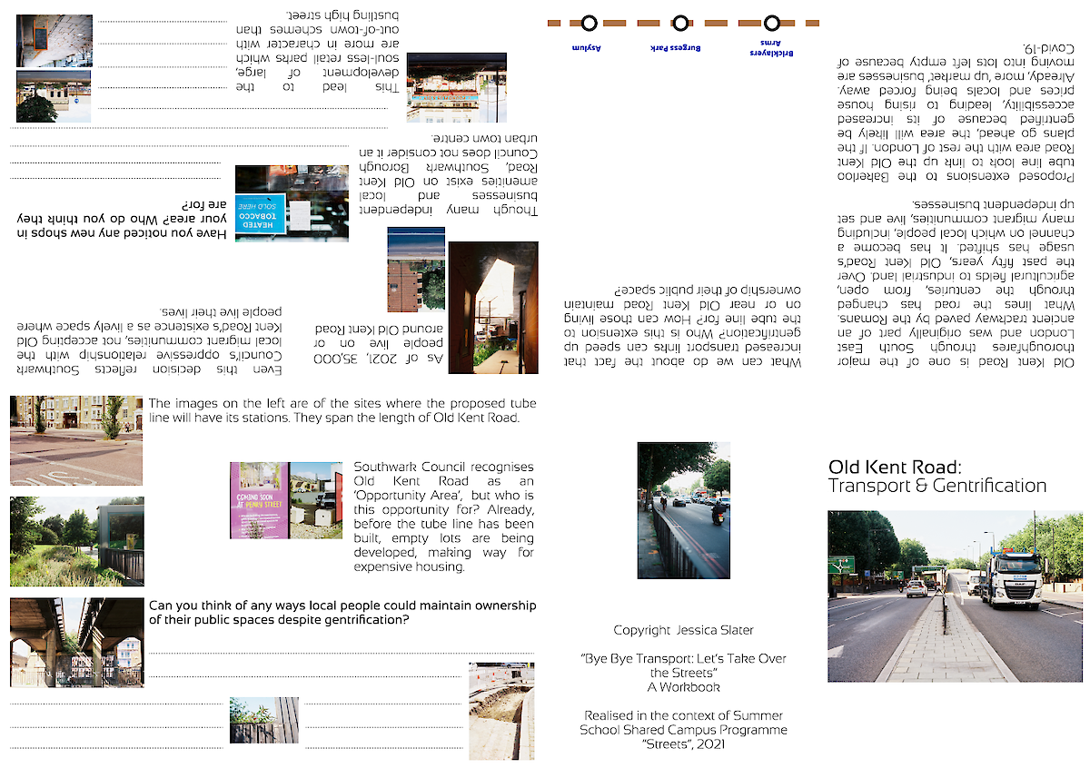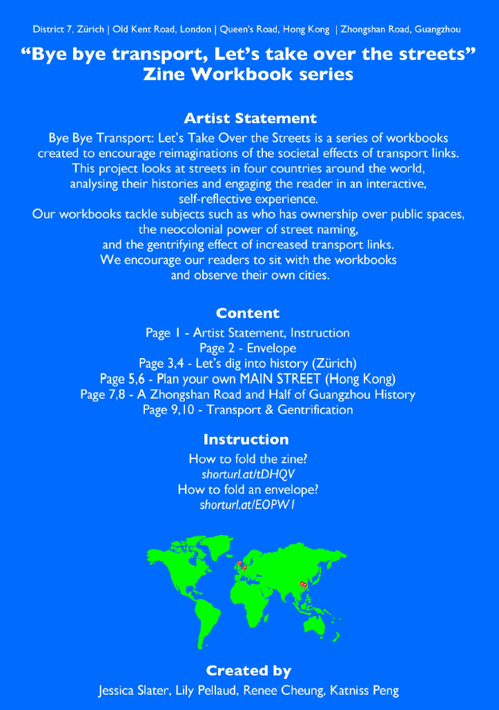 “Bye Bye Transport, Let’s Take Over the Streets!” is a series of workbooks created to encourage reimaginations of the societal effects of transport links. This project looks at streets in four countries around the world, analysing their histories and engaging the reader in an interactive, self-reflective experience. Our workbooks tackle subjects such as who has ownership over public spaces, the neocolonial power of street naming, and the gentrifying effect of increased transport links. We encourage our readers to sit with the workbooks and observe their own cities.